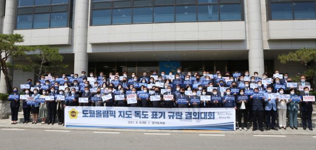 경기도의회 의원들은 8일 오전 제352회 정례회 1차 본회의를 앞두고 의회 현관 앞에서 `도쿄올림픽 지도 독도 표기 규탄 결의대회`를 가졌다.경기도의회는 결의문을 통해 “독도에 대한 야욕중단과 도쿄 올림픽 지도의 독도 표기를 삭제하라”고 일본 정부에 강력 촉구했다.