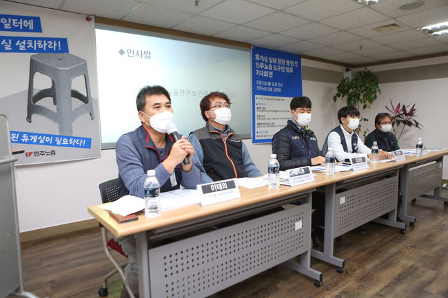 이들은 15일 민주노총 15층 교육장에서 `휴게실 실태 현장 증언 및 민주노총 요구안 발표 기자회견`을 열고 "휴식권은 모든 노동자의 당연한 권리로, 복지의 영역이 아니라 안전과 건강을 위한 사업주의 의무"라며 "모든 일터에는 차별 없이 휴게시설이 제공돼야 한다"고 강조했다.