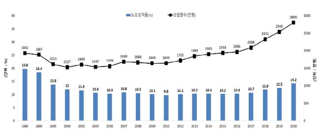 노조조직률 및 조합원수 추이 (자료=고용노동부)