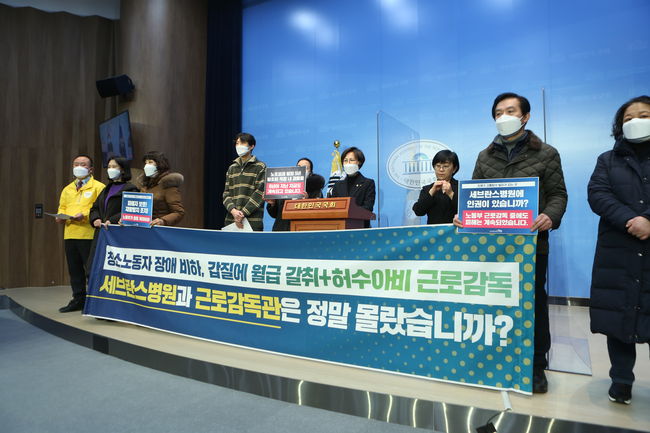 강은미 정의당 의원과 민주노총 공공운수노조 서울지역공공서비스지부는 11일 국회 소통관에서 `세브란스 병원 청소노동자 직장 내 괴롭힘 문제 해결 촉구 기자회견`을 열고 "고용노동부(이하 노동부)는 지금이라도 세브란스병원에서 일어난 직장 내 괴롭힘에 대해 엄정하게 감독하고 조치해야 한다"고 촉구했다.