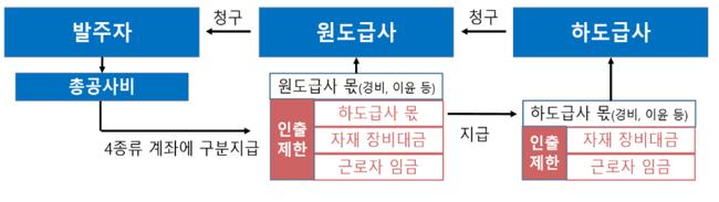 이에 국토부는 공사대금 청구 단계에서부터 하도급사, 건설근로자, 자재·장비업자가 수령할 부분을 구분하도록 하고, 시스템 상에서 건설사가 임의로 출금할 수 없는 약정계좌를 통해 각각의 수령자에게 지급되도록 대금 청구·지급 절차를 강화했다.