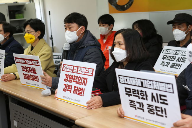 이들은 기자회견을 통해 ▲경영자 단체 중대재해기업처벌법 개악 및 무력화 시도 즉각 중단 ▲정부·법원, 엄정한 법 집행 및 경영책임자 강력 처벌 ▲5인 미만 적용제외 삭제, 중대재해기업처벌법 전면 적용 즉각 개정 등을 강조했다.