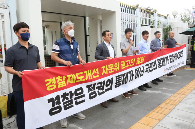전국시도청경찰직장협의회 회장단은 23일 서울 종로구 정부서울청사 앞에서 `경찰제도개선 자문위 권고안 철회와 행정안전부 경찰국 신설 폐지 촉구` 기자회견을 가졌다.기자회견에서 이들은 “(자문위 권고안은)경찰의 지휘·인사·감찰·징계 등의 권한을 이용해 경찰을 실질적으로 통제하겠다는 것”이라며 “경찰의 정치적 중립성과 독립성을 훼손하는 일련의 행위를 당장 멈춰야 한다”고 촉구했다.