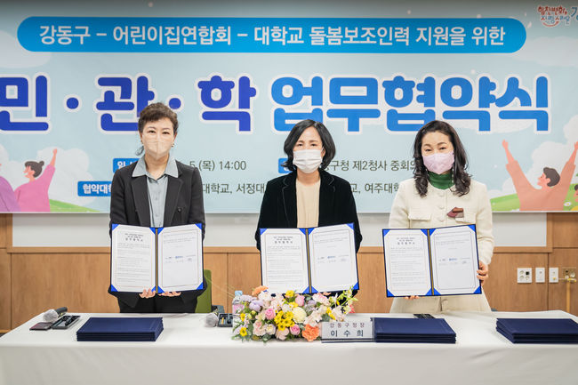 강동구는 5일 어제 강동구어린이집연합회 및 6개 대학교와 업무협약을 체결하고 돌봄보조인력을 지원하기로 했다고 밝혔다.