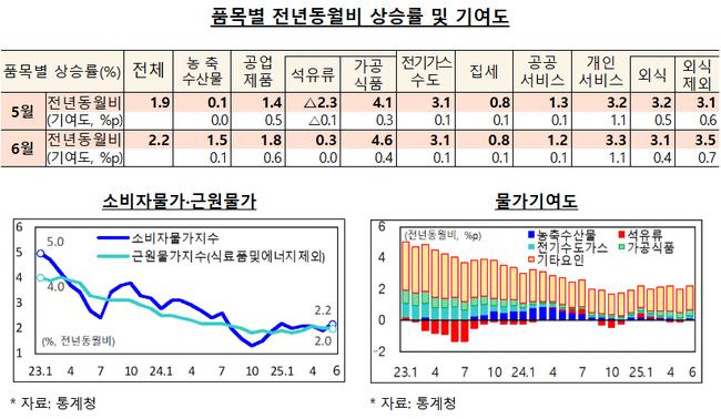 2025년 6월 소비자물가지수(CPI)가 전년 동월 대비 2.2% 상승하며 5월(1.9%)보다 오름폭이 확대됐다.