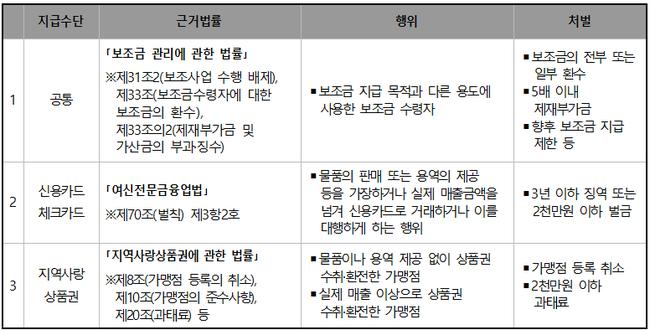 행안부는 주요 부정행위 유형별 법적 처벌 기준도 함께 제시했다. 보조금 목적 외 사용 시에는 전액 환수 및 최대 5배 제재부가금 부과, 카드거래 허위 매출은 형사처벌, 가맹점 부정환전은 행정처분 및 과태료 부과가 핵심 내용이다.