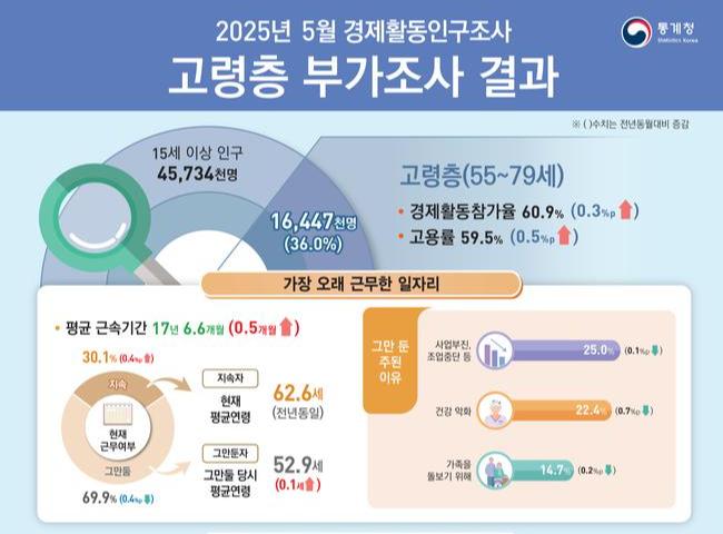 통계청이 발표한 2025년 5월 고령층(55~79세) 부가조사 결과에 따르면, 고령층 인구는 1,644만 7천명으로 전년 동월 대비 46만 4천명 증가했다.
