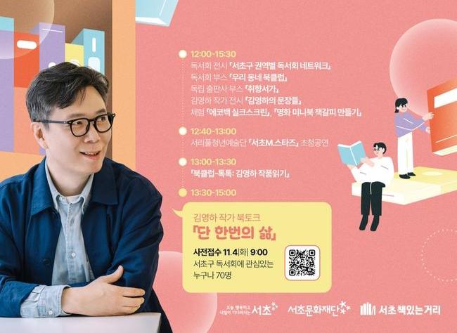 이번 행사의 하이라이트는 대한민국 대표 스토리텔러인 김영하 작가와의 만남이다. 2025년에 발표한 산문집 `단 하나의 삶`을 주제로 북토크를 진행해, 참여자들에게 인생과 독서에 대한 깊이 있는 통찰과 영감을 선사하며 다양한 이야기를 나눌 예정이다.