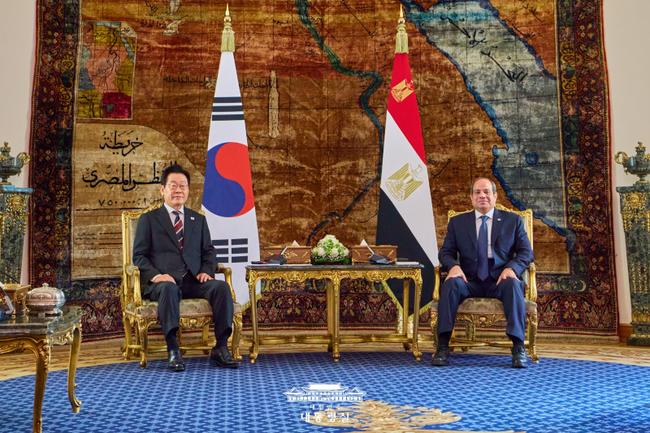 이집트를 공식 방문 중인 이재명 대통령이 20일(현지시간) 카이로 대통령궁에서 압델 파타 알시시 대통령과 한 · 이집트 단독 정상회담을 하고 있다.