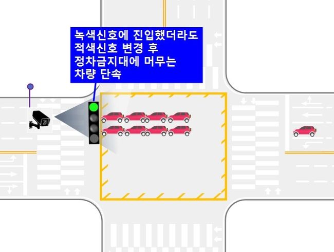 단속은 정차금지지대가 설치된 교차로에서 이뤄진다. 녹색신호에 교차로에 진입한 차량이 적색신호로 전환된 이후에도 일정 시간 정차금지지대를 빠져나가지 못하고 머무르는 경우 위반으로 처리된다. 다만 교통사고, 갑작스러운 고장 등 불가피한 사유로 정차금지지대에 머문 차량은 단속에서 제외된다.