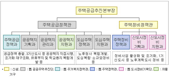 공급본부는 공공·민간을 아우르는 주택공급 컨트롤타워로서 정책 기획부터 실행, 관리까지 전 과정을 책임진다. 조직은 공공 공급을 주도하는 주택공급정책관과 민간 공급을 관리·지원하는 주택정비정책관 등 2정책관 9과 체제로 운영된다. 주택공급정책관 산하 6개 과는 3기 신도시를 포함한 공공택지 조성과 도심권 공급을 전담하고, 주택정비정책관 산하 3개 과는 재개발·재건축과 1기 신도시 정비 등 민간 주도 공급을 담당한다.
