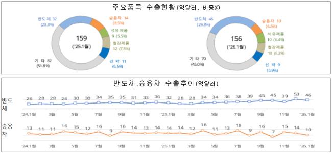 1월 초 수출입 동반 감소…무역수지 27억 달러 적자 - 1~10일 수출 156억 달러, 전년 대비 2.3% 감소 - 수입도 4.5% 줄며 무역적자 확대 - 반도체 수출 급증 속 자동차·선박 부진 지속