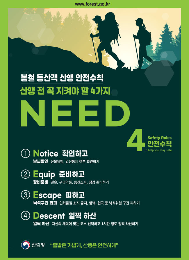 산림청이 해빙기와 건조한 날씨로 산행 안전사고와 산불 위험이 높아지는 봄철을 맞아 ‘니드(NEED) 안전수칙’ 준수를 당부했다.