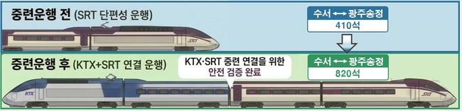 시범 중련운행은 호남선과 경부선 일부 구간에서 우선 시행된다. 호남선은 토·일요일 수서와 광주송정을 오가는 일부 열차에 적용된다. 기존에 한 대의 SRT만 운행하던 열차에 KTX를 추가로 연결해 좌석 수를 확대한다.