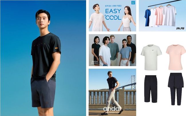 이미지 설명: (왼쪽부터 시계방향) K2 `오싹 시리즈`, 아성다이소 `이지쿨 의류`, 자주 `자주 에어 시리즈`, 프로스펙스 `냉감 기능성 퍼포먼스 의류`, 무신사 `쿨탠다드 라인`, 안다르 `에어프라임 맨즈 슬랙스` (사진 제공=각 사)