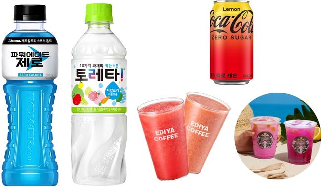 이미지 설명: (왼쪽부터 시계방향) 코카-콜라사 `파워에이드 제로`, 코카-콜라사 `토레타!`, 코카-콜라사 `코카콜라 제로 레몬`, 스타벅스 `망고 용과 레모네이드 스타벅스 리프레셔`와 `퍼플 드링크 위드 망고 용과 스타벅스 리프레셔`, 이디야 `생과일주스` (사진 제공=각 사)