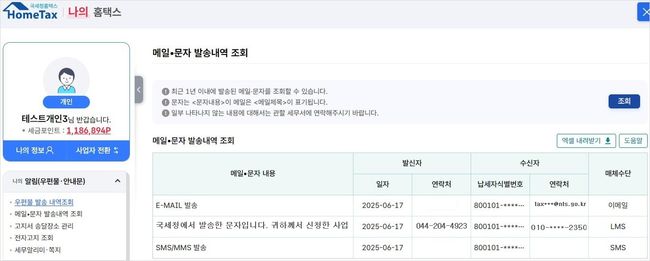 모바일 홈택스(손택스) 제공 화면 [모바일 홈택스] → [My홈택스] → [메일・문자발송내역조회]