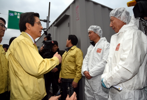 황교안 대통령 권한대행이 19일 경기 이천시 AI방역현장을 방문, 방역현장 점검 및 담당자를 격려하고 있다.