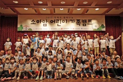 ▲ 우체국 행복나눔 소아암 어린이 가족캠프 가족 참가자가 단체 사진을 촬영하고 있다한국백혈병어린이재단과 우체국공익재단이 주관하고 우정사업본부가 주최하는 ‘2017 우체국 행복나눔 소아암 어린이 가족캠프’가 19~ 20일 이틀간 경기도 용인시에 위치한 에버랜드에서 열렸다.