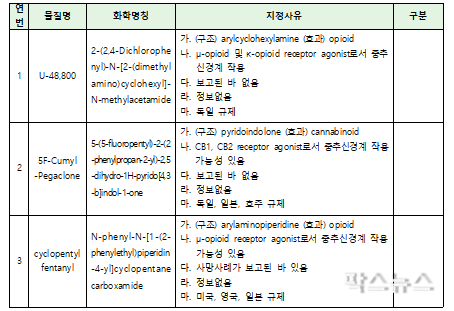 U-48800과 cyclopentylfentanyl은 오피오이드로 마약과 유사한 남용 및 유해성 유발 가능성이 있고, 5F-Cumyl-Pegaclone은 향정신성의약품 JWH-018과 유사한 작용을 해 국민 보건 상 위해가 우려되는 물질이다.