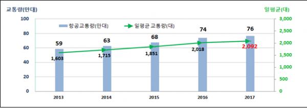 국토교통부는“세계 항공시장 전망보고서(Airbus, Flying by Numbers 2017-2036)”를 인용해 향후 20년간 세계 항공교통량은 연 4.4% 증가(아태지역 5.6%) 할 것으로 전망된다고 말했으며, 최근 5년간(2013년∼2017년) 우리나라의 항공교통량은 연 6.9% 증가로 세계교통량 평균 증가치(5.6%)를 넘는 증가 추세를 보이고 있다고 밝혔다.