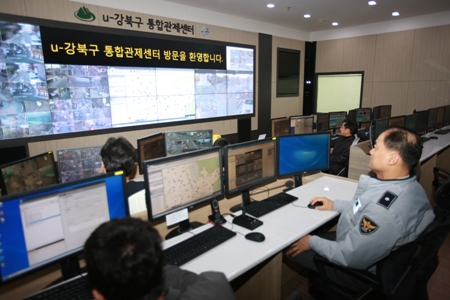 강북구(구청장 박겸수)가 미아동 복합청사 지하 1층에 u-강북구 통합관제센터를 설치, 관내 CCTV 484대를 24시간 상시 모니터링 하고 있다.