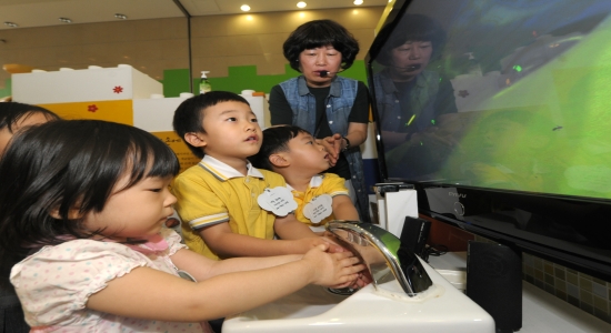 손씻기 코너의 모니터 앞에 서면 세균이 나타나지만 이내 손을 씻으면 세균이 사라진다. 아이들이 무척 좋아한다.