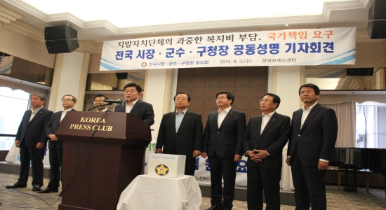 전국시장ㆍ군수ㆍ구청장협의회(대표회장 조충훈 순천시장)는 지난3일 오전 한국프레스센터에서 '전국 시장ㆍ군수ㆍ구청장 공동성명서'를 통해 자치단체의 과중한 복지비부담 완화를 위한 중앙정부차원의 특단의 재정지원 대책을 촉구했다.