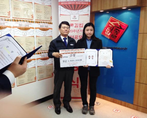 종로김밥 창립 20주년을 맞이해 개최된 이번 공모전은 '종로김밥과 함께 만들어 가는 행복한 세상'을 표현하는 창의적인 캐릭터를 공모했다. 종로김밥 ‘Imagine Your Jongro Kimbap! 캐릭터 전국 공모전’에서 서울강서캠퍼스의 시각정보디자인과 김현영 학생이 참여해 금상과 함께 상금 100만원을 수상해 개인적인 기쁨과 함께 학교의 위상을 떨쳤다.