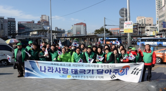 동대문구(구청장 유덕열)는 제96주년 3.1절 및 광복70주년을 맞아‘나라사랑 태극기 달기운동’을 추진하고 관내 국기 게양률을 높일 수 있는 분위기를 조성하고 있다. 이를 위해 지난 26일부터 3월 1일까지를 태극기 달기 운동을 집중 홍보하는 ‘태극기 게양주간’으로 정하고, 청량리역 광장에서 새마을운동 동대문구지회와 연계해 차량용 태극기를 무료로 나눠주는 캠페인도 전개했다.