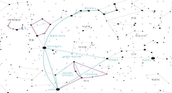 ‘봄철의 대곡선’에서 처음 만나는 목동자리의 으뜸별 아르크투루스(Arcturus)는 오렌지색의 1등성으로 ‘곰의 감시인’이란 뜻을 가지고 있습니다. 이 별이 별자리 이름과 무관한 이름을 가지게 된 것은 그 기원이 아랍이기 때문입니다. 별자리 이름은 그리스 신화를 바탕으로 라틴어로 되어 있지만 별 이름은 대부분 아랍어에 어원을 두고 있습니다.