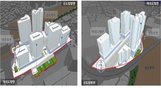 또 영등포역과 대상지 인근에 위치한 타임스퀘어와 직접 연결하는 지하보행로를 설치하고 녹지축 형성을 위해 대규모 문화공원과 공개공지를 조성한다. 이를 통해 시민휴식공간도 확보하게 된다. 아울러 쪽방촌 거주자들의 재정착을 위한 방안으로 사회복지시설과 임대주택 등도 건립할 예정이다.