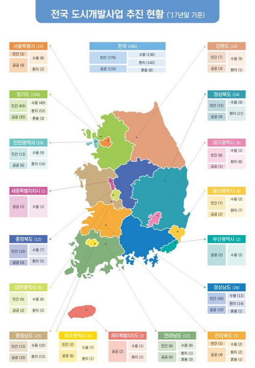 국토교통부는 17개 광역지자체 등을 대상으로 실시한 도시개발사업 현황조사를 바탕으로 2017년 말 기준 전국 도시개발구역 현황 통계를 발표했다.