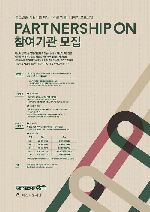 재단은 청소년 관련 비영리기관 발전지원 프로그램 '파트너십 온(Partnership ON)'을 시작하고, 이를 위해 4월부터 대전·부산·광주·제주·서울 등 전국 5개 지역에서 설명회를 개최한다고 27일 밝혔다.