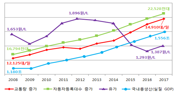 지난 2017년 전국 하루 평균 교통량은 14,910대로 지난해 대비 2.7%, 10년 전인 ‘08년보다는 23.0% 증가한 것으로 나타났다.