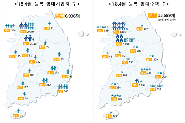 ▲ 등록 임대사업자 수 국토교통부 는 4월 한 달간 전년동월 대비 1.9배 증가한 6,938명이 임대사업자로 신규 등록하여 작년 12월 13일 '임대주택 등록 활성화 방안' 발표 이후 임대사업자 등록이 지속 증가하고 있으며, 이번 달에는 8년 이상 임대되는 준공공임대주택 등록 비중이 69.5%를 차지하여 지난 달에 비해 크게 늘어났다고 밝혔다.