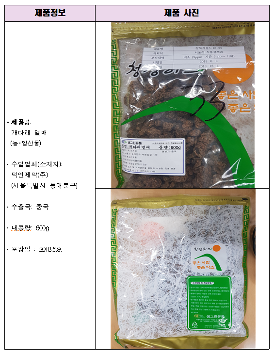 식품의약품안전처는 식품수입판매업체 덕인제약이 수입하여 판매한 중국산 ‘개다래 열매’에서 비소가 기준초과 검출되어, 해당 제품을 판매중단 및 회수조치 한다고 밝혔다.