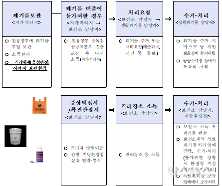 폐기물은 배출 단계에서부터 소독·밀봉하고 별도 보관장소에서 보관 후, 전담 폐기물 업체에서 당일 운반해 안전하게 소각처리된다.
