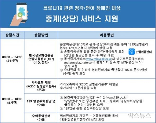 보건복지부는 청각·언어장애인의 원활한 코로나19 문의·상담을 위해 손말이음센터에 수어 등 중계 지원 확대를 요청했다.