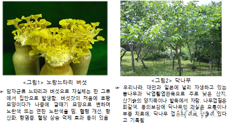 피부 노화 예방 소재인 노랑느타리버섯과 닥나무 노랑느타리버섯은 담자균류 느타리과 버섯으로 혈액순환 개선, 항산화, 항염증, 혈당 상승 억제 등의 효과가 있다.