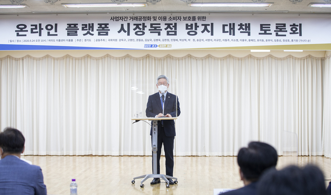 이 지사는 24일 여의도 이룸센터에서 열린 ‘온라인 플랫폼 시장독점 방지 대책 토론회’ 환영사를 통해 “세계경제 질서가 소위 디지털 경제 플랫폼 경제로 기술혁명의 새로운 시대를 맞고 있다”며 “경부고속도로나 영동고속도로 같은 중요한 기반시설을 특정 개인, 업체가 독점해 통행료를 마음대로 받고 있는 것과 같은 상황”이라고 말했다.