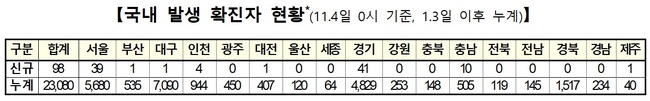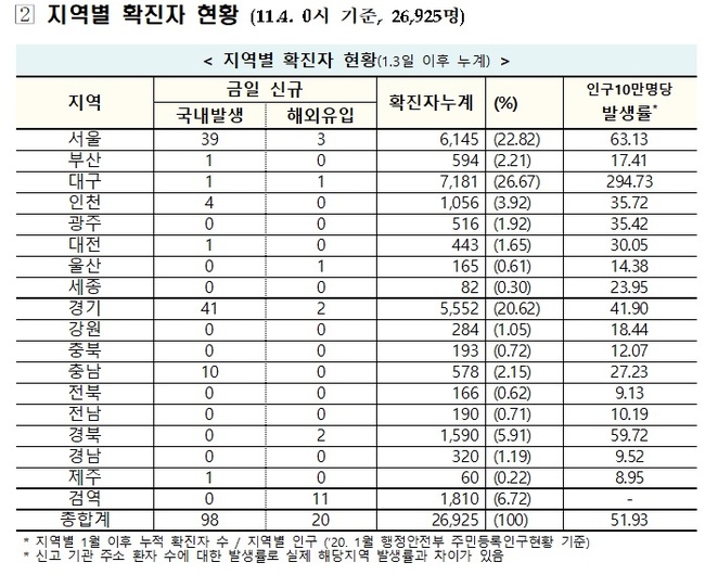 질병관리청 중앙방역대책본부는 11월 4일 0시 기준으로, 국내 발생 신규 확진자 98명이 확인됐고, 해외유입 사례는 20명이 확인돼 총 누적 확진자 수는 2만 6925명이라고 밝혔다. 이 중 해외유입 환자 수는 3845명이다.