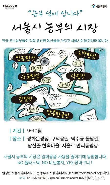 서울시는 오는 9월부터 10월까지 광화문광장, 만리동광장, 덕수궁돌담길, 구의공원, 남산한옥마을 등 도심공원 5개소에서 우수농수특산물과 문화축제가 어우러지는 ‘농부의 시장’을 연다고 밝혔다.