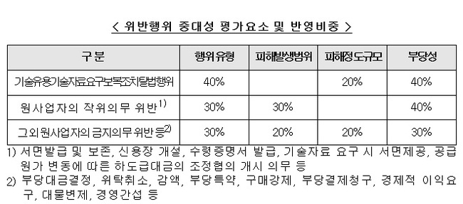 기술유용·보복조치·탈법행위 등 주로 1~2개 업체를 대상으로 발생하는 악의적 위반행위의 경우 ‘피해발생의 범위’ 요소는 삭제하고 ▲행위유형 ▲피해정도 및 규모 ▲부당성만 고려해 평가하고, 서면발급, 지급 보증의무 등 금전적 피해와 무관한 의무위반은 ‘피해정도’ 지표 대신 ▲행위유형 ▲피해발생의 범위 ▲부당성만을 고려하여 평가하게 된다.