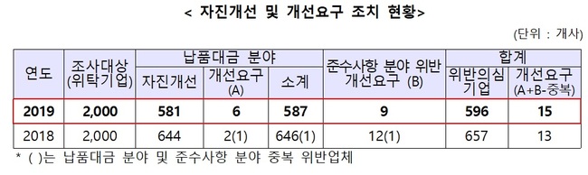 납품대금 분야 위반 의심기업 587개사 중 581개사는 조사과정에서 피해금액 지급을 통해 자진 개선했으며, 나머지 6개사중 3개사는 개선요구 조치에 따라 개선을 이행함으로써 총 49억 6000만원의 피해금액을 수탁기업에게 지급했다.