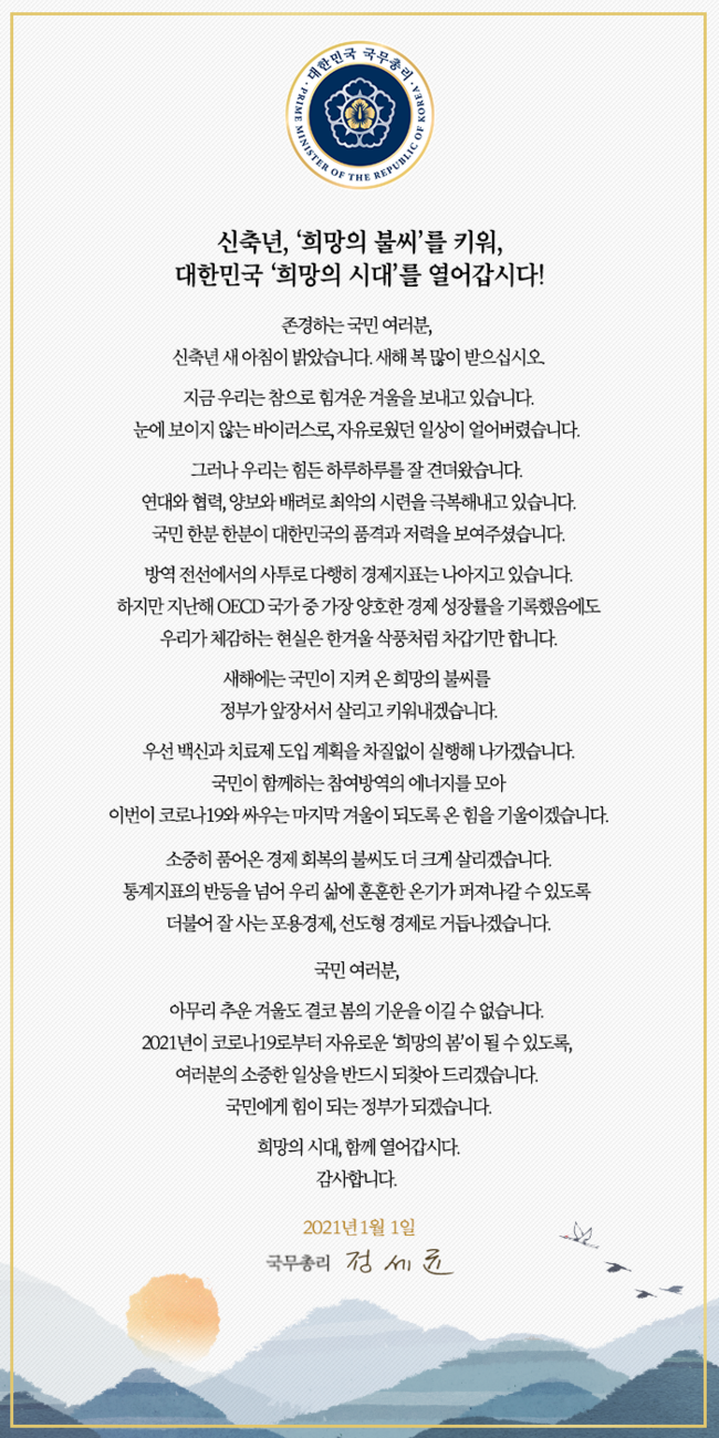 정 총리는 코로나19로 힘겨웠던 2020년을 돌아보며 연대와 협력, 일상에서 지켜진 방역수칙에 지지와 응원을 보탰다. 그는 새해에 코로나19 백신 도입을 차질 없이 수행할 것을 약속하며 경제 및 일상의 빠른 안정화를 위해 노력하겠다고 전했다.