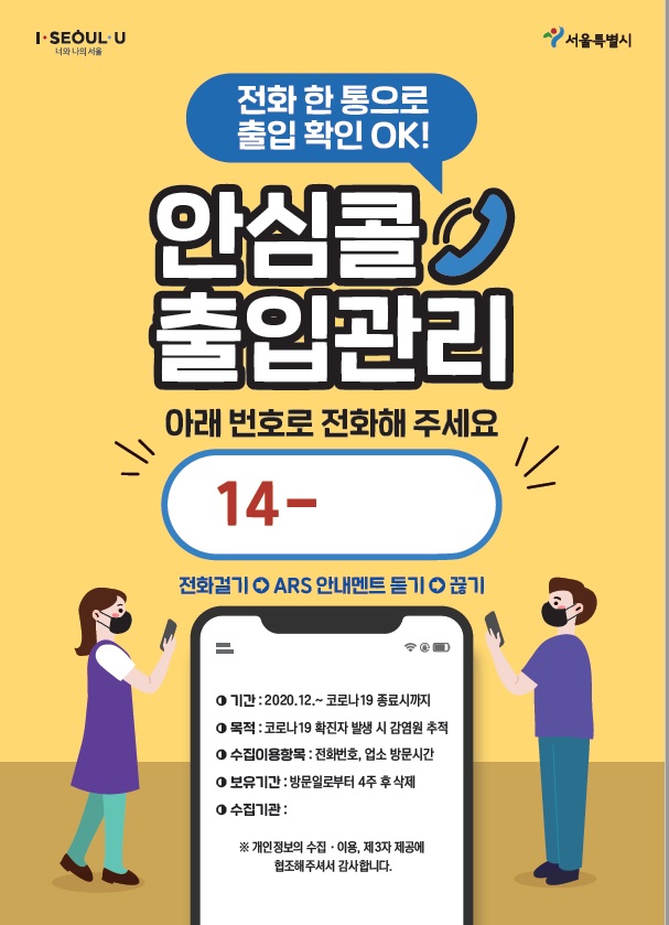 서울시가 QR코드 사용이 어려운 디지털 취약계층이 주로 이용하는 공공청사, 복지시설, 의료기관, 전통시장 등 72개 시설에 전화 한통만으로 출입이 확인 가능한 ‘안심콜 출입관리’ 서비스를 1월 7일 오늘부터 도입한다.