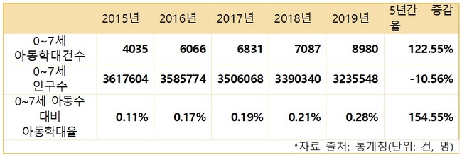 사회의 아동은 줄어드는데, 아동에 대한 학대는 늘어나는 기이한 수치다.