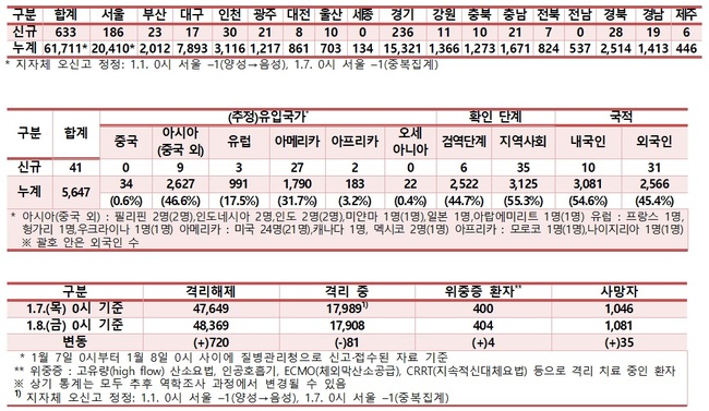 질병관리청 중앙방역대책본부가 발표한 자료에 따르면 1월 8일 0시 기준 국내 발생 신규 확진자는 633명이고, 해외유입 사례는 41명이다. 누적 확진자 수는 6만 7358명이다.
