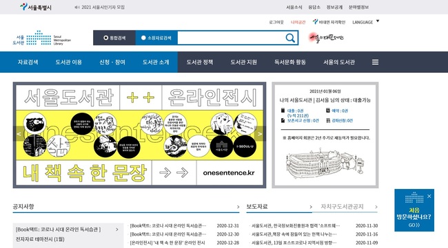 서울도서관 홈페이지 (자료=서울시)서울도서관이 코로나19가 장기화됨에 따라 도서관에 오지 않고도 스마트폰이나 PC로 인기도서와 신간을 바로 빌려볼 수 있도록 온라인 콘텐츠 1만 8000종을 신규로 업데이트했다고 전했다. 11일 오늘부터 서울도서관 홈페이지에서 무료로 볼 수 있다.